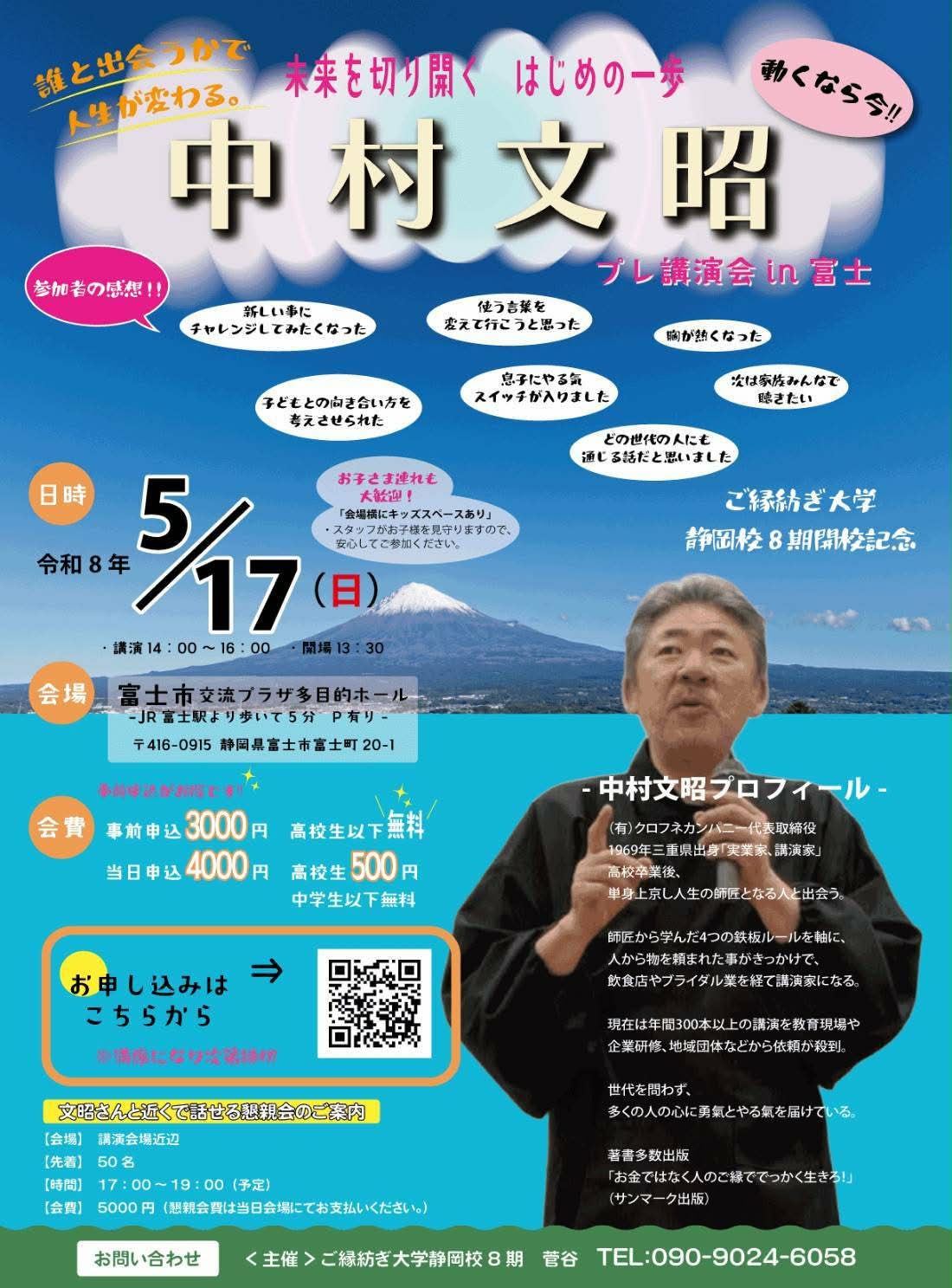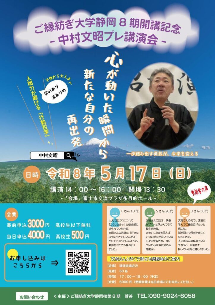 | 問い合わせ先 | ご縁紡ぎ大学静岡校 菅谷 TEL 090-9024-6058 Mail myhmay2723@gmail.com |